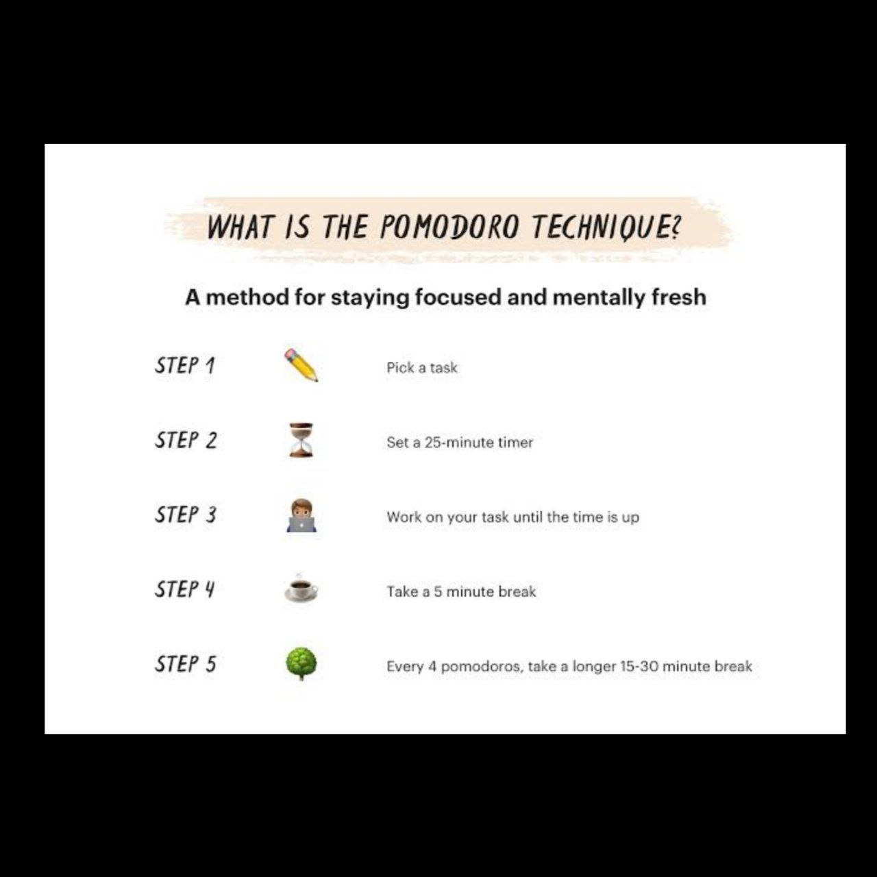 - I'll use the Pomodoro technique as I work to avoid getting bored or zoning out. (might use 15 mins timer though)